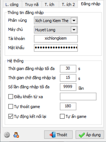 - Sau đó tại Autopk chọn mục Đăng Nhập chọn Phân Vùng và Máy Chủ > điền tên tài khoản và mật khẩu > tích vào ô Tự Động kết nối lại