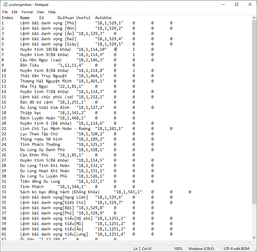 Cột thứ ba: Để số 1 – Sẽ tự sử dụng Vật Phẩm, 0 – Sẽ không tự sử dụng Vật Phẩm