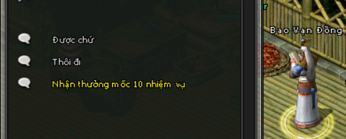 | Bao Vạn Đồng | Thời gian : cả ngày NPC Bao Vạn Đồng Hoàn thành 10 Nhiệm Vụ nhận nhiều huyền tinh, đồng khóa, bạc khóa, kinh nghiệm Hoàn thành nhiệm vụ thứ 10 nhận thêm : 10 vạn mốc nạp, 10 thẻ hoạt động, 5 uy danh, 6 huyền tinh cấp 5, 50 vạn bạc khóa, 10 vạn đồng khóa, 10 Uy Danh ![]() |
